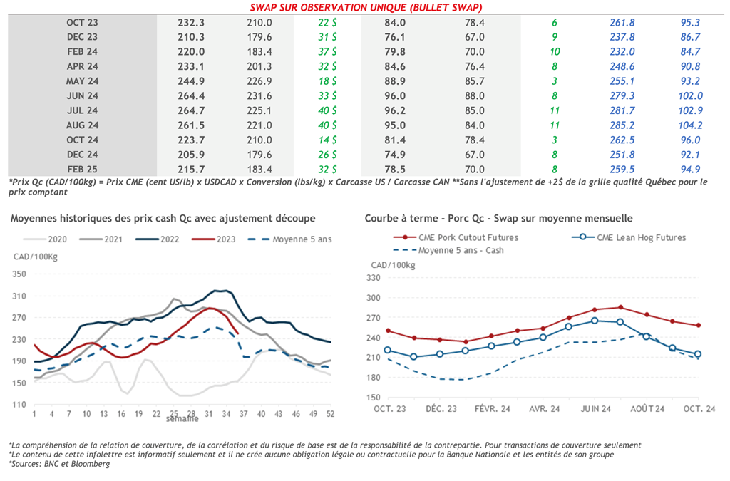 • Les contrats à terme sur le porc avec des échéances jusqu'á juillet-24 étaient tous en hausse hier, menés par le contrat actif d’octobre-23 qui gagnait 3,30% sur la journée pour atteindre 85,28 cents US/lb.