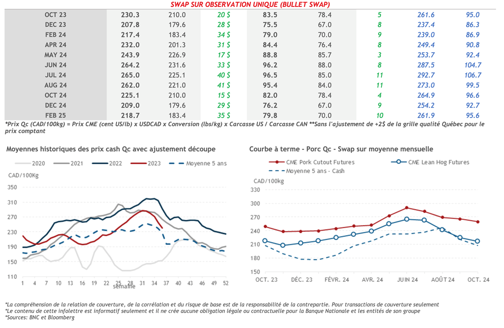 • Les contrats à terme sur le porc pour toutes échéances étaient en baisse hier, avec celui pour Déc-23 et Fév-24 qui ont enregistré la plus forte baisse de -1.250 cents US/lb et -1.150 cents US/lb respectivement.