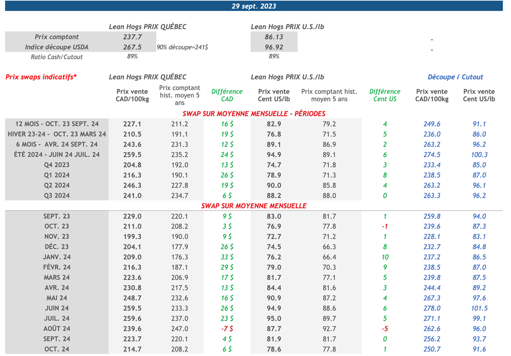 • Les contrats à terme sur le porc étaient en forte hausse hier alors que l’attendu rapport « Hogs and Pigs » était publié après la fermeture du marché. Notamment, le contrat actif de décembre-23 a gagné ~3,8 % sur la journée.