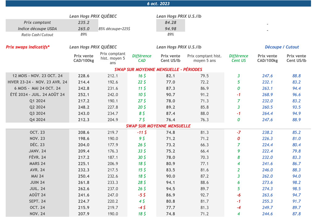 • Les contrats à terme sur le porc étaient en hausse hier, menés par le contrat actif de Décembre-23 qui a gagné 3,10 cents US/lb sur la journée pour s’établir à 72.28 cents US/lb.