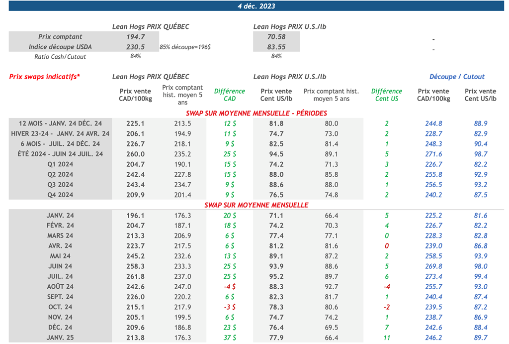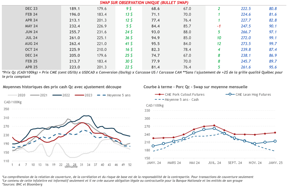 • Les contrats à terme sur le porc ont terminé de manière mitigée vendredi dernier, les maturités rapprochées terminant dans le rouge. Notamment, le contrat de février-24 a connu la plus forte baisse, s'établissant à 70,10 cents US/lb, pour une perte journalière de 1,38 cents US/lb.