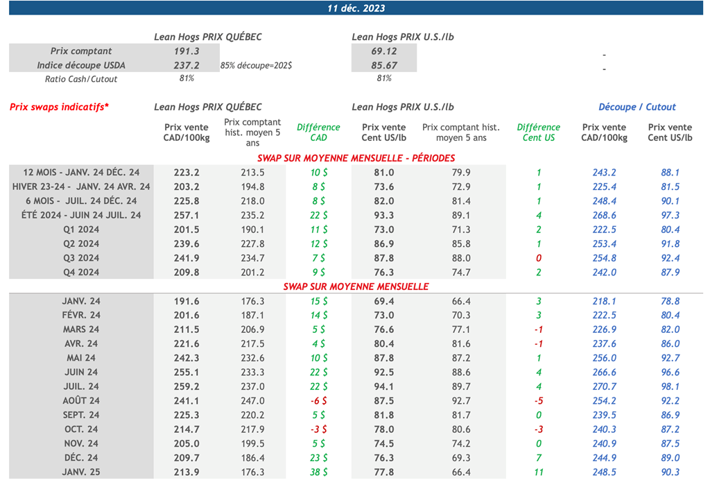 • Les contrats à terme sur le porc ont tous terminé en territoire positif vendredi, menés par le contrat d’avril-24 qui a gagné 1,53 cents US/lb sur la journée pour terminer à 76,15 cents US/lb.