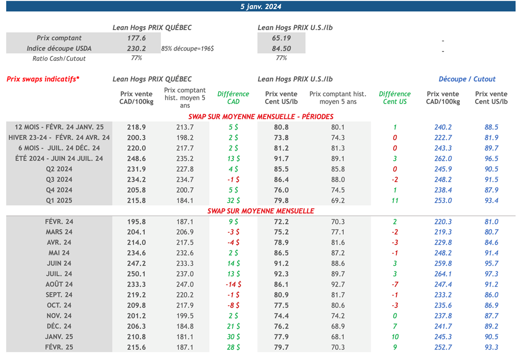 • La croissance de l'emploi aux États-Unis s'est accélérée en décembre, le nombre d'emplois non agricoles ayant augmenté de 216k, ce qui est supérieur à la prévision médiane des économistes de 175k. Le salaire horaire moyen a aussi augmenté plus qu’attendu, avec une croissance de 0,4% par rapport au mois précédent. Suite à l’annonce, les rendements obligataires étaient en hausse alors que les marchés ajustaient à la baisse la probabilité d'une baisse de taux d'intérêt de la Réserve fédérale en mars.