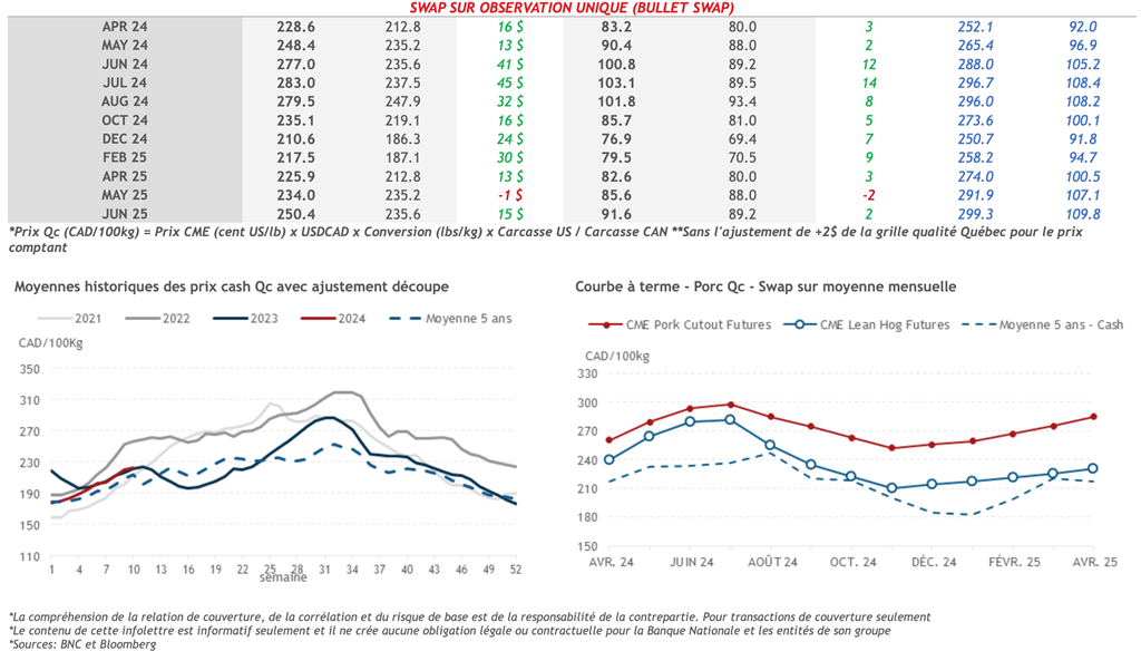 • Les contrats à terme sur le porc ont terminé de manière mitigée la semaine dernière, les échéances rapprochées terminant en territoire négatif alors que contrats venant à échéance en 2e moitié d’année étaient en légère hausse. Le contrat ayant le plus fluctué fut celui d’avril 24 qui a perdu 3,75% au cours de la semaine, s’établissant à 84,38 cents US/lb vendredi.