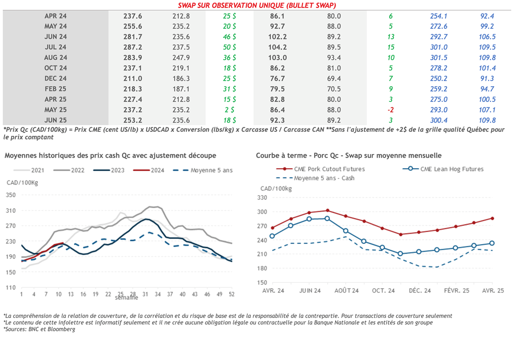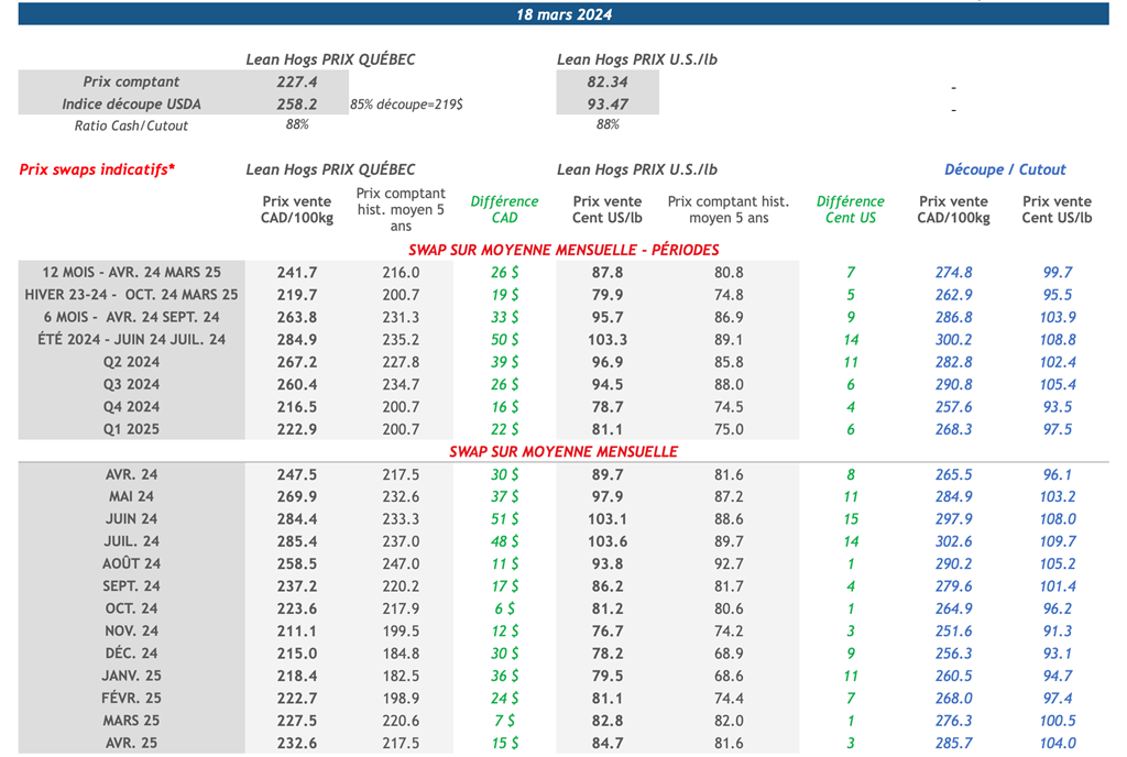 • Les contrats à terme sur le porc ont poursuivi leur trajectoire haussière la semaine dernière, menés par les échéances rapprochées. % au cours de la semaine, s’établissant à 84,38 cents US/lb vendredi. Notamment, le contrat d’avril-24 a gagné 2,18 cents US/lb sur la semaine pour s’établir à 84,38 cents US/lb vendredi.