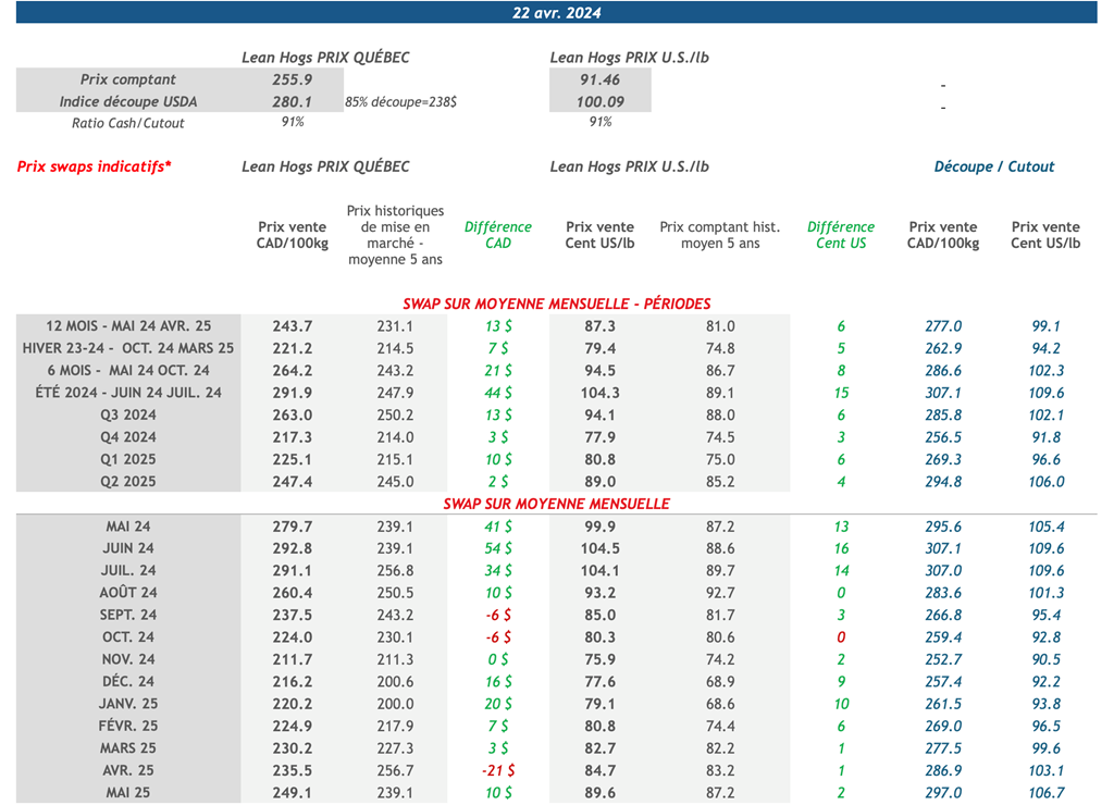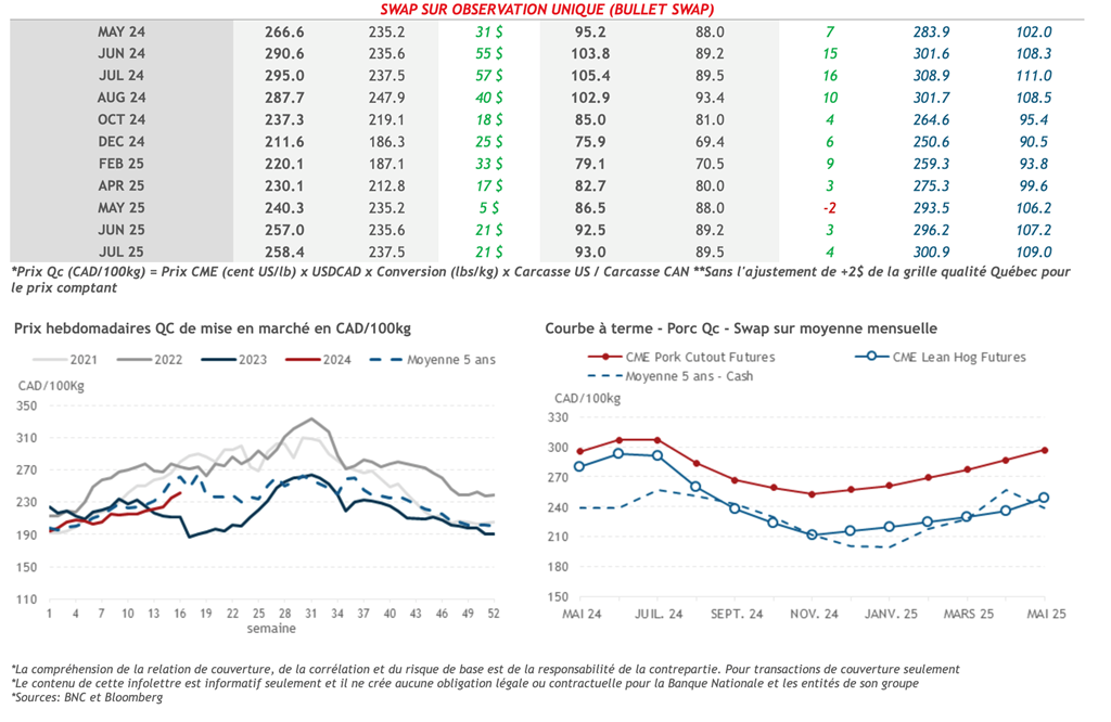 • La semaine dernière, les contrats à terme sur le porc pour l'année à venir ont tous enregistré une hausse, avec les mois de juin-24 à août-24 affichant les plus grandes augmentations. Le mois de juillet-24 a notamment augmenté de 2,725 cents US/livre au cours de la semaine.