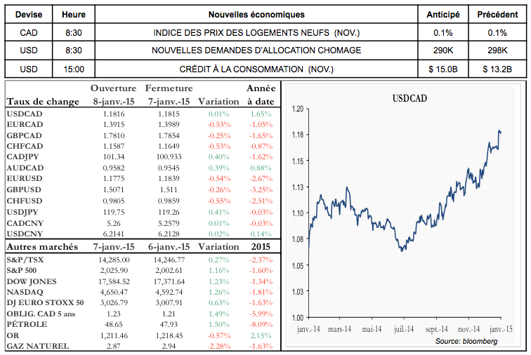 - En cette journée de deuil national et de chasse à l’homme en France, l’euro a poursuivi sa dépréciation pour un 5e jour consécutif. Les usines allemandes ont vu leur carnet de commandes diminuer de -2.4 % et l’indice des prix à la production dans la zone euro s’est contracté plus qu’anticipé, -1.6 % au lieu de - 1.4 %. Suite à cette nouvelle récente série de mauvaises nouvelles en Europe, le marché s’attend à une intervention de la BCE très prochainement.