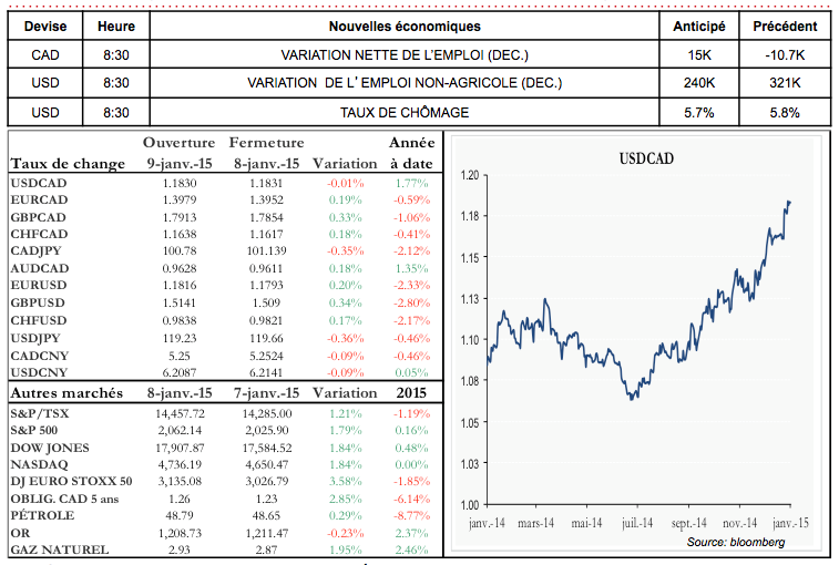 - L’accumulation de mauvaises nouvelles en provenance de l'Europe augmente la pression sur la BCE qui nous dévoilera ses plans le 22 janvier prochain. Selon une source interne, les analystes de la BCE auraient présenté aux membres du conseil des scénarios d’achats d’actifs (QE) pour près de 500 milliards d’euros. Le 21 janvier, la BoC nous partagera sa nouvelle lecture sur l’impact de l’effondrement des prix du pétrole sur l’économie canadienne. En octobre dernier, M. Poloz évaluait que la baisse allait coûter 0.3 % de croissance au Canada. Le pétrole valait près de 80 $. Il vaut 48.50 $ ce matin!