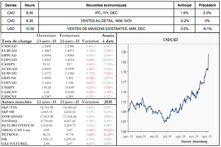 - La Banque centrale européenne a annoncé, hier, la mise en place d’un programme d’assouplissement quantitatif qui consiste à racheter l’équivalent de 60 milliards d’euros par mois en obligations gouvernementales. Le programme débutera en mars et devrait se terminer en septembre 2016. Toutefois le président de la BCE ne ferme pas la porte à un prolongement de la période d’injection de liquidités dans le cas où l’inflation de la zone euro peinerait à atteindre le niveau cible de 2 %. La paire EURUSD qui connaissait déjà une période difficile a évidemment souffert de cette nouvelle et est en chute de 450 pts.