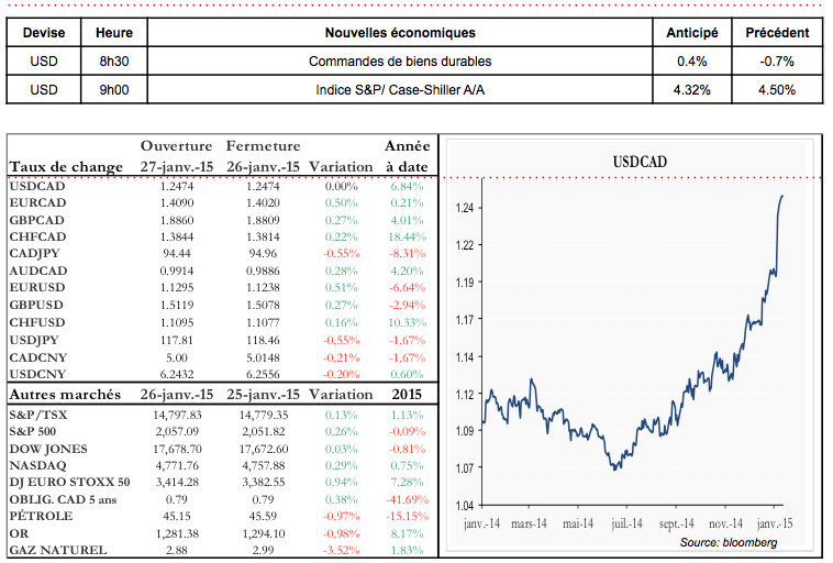 - L’élection du parti Syriza en Grèce, dimanche dernier, élu sur la promesse de restructurer la dette souveraine du pays, continue de faire couler de l’encre alors qu’on s’interroge sur ce que les autres pays membres de l’UE seront prêts à accepter. Fidèle à elle-même, l’Allemagne nous en donne un indice à travers son ministre des Finances déclarant que la situation en Grèce découle non pas des décisions de l’Union, mais plutôt de décennies d’échecs de la part des dirigeants grecs. Bref, même si l’euro semble s’être stabilisé pour l’instant, il y a fort à parier que les négociations seront houleuses.