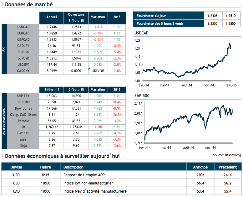 Dans l’attente des données sur l’emploi prévues vendredi matin, nous surveillons aujourd’hui les données d’emplois ADP à 8 h 15 ainsi que l’ISM non-manufacturier à 10 h. Suite à la hausse des derniers jours, le pétrole est en repli, ce matin, et la Chine vient tout juste de réduire le taux de réserve obligatoire des banques pour stimuler son économie.