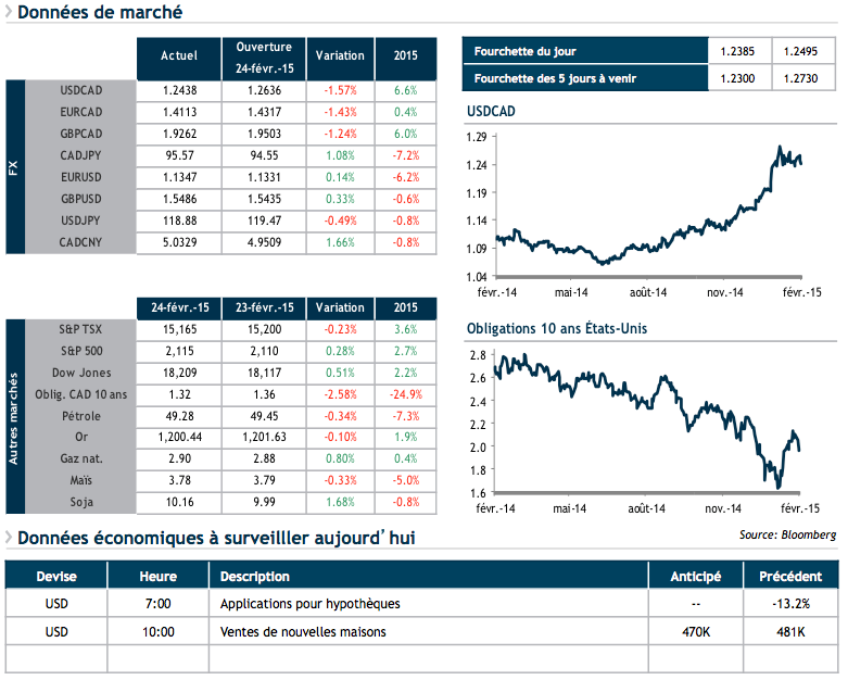 M. Poloz a quant à lui indiqué qu’il se montrerait patient avant de procéder à une nouvelle baisse de son taux directeur. La baisse surprise du 21 janvier dernier devrait permettre à la Banque du Canada de se donner du temps pour mieux comprendre les impacts de la dégringolade des prix du brut sur l’économie canadienne. Ses deux interventions ont eu pour effet de faire regagner près de 2% à notre huard face au billet vert.