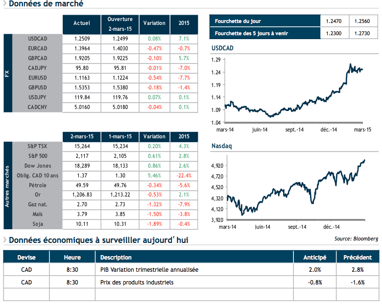 Au Canada, nous attendons ce matin les chiffres du PIB pour le dernier trimestre de 2014. Les analystes anticipent une croissance de 2% pour cette période. En plus, nous aurons les prix des produits industriels.