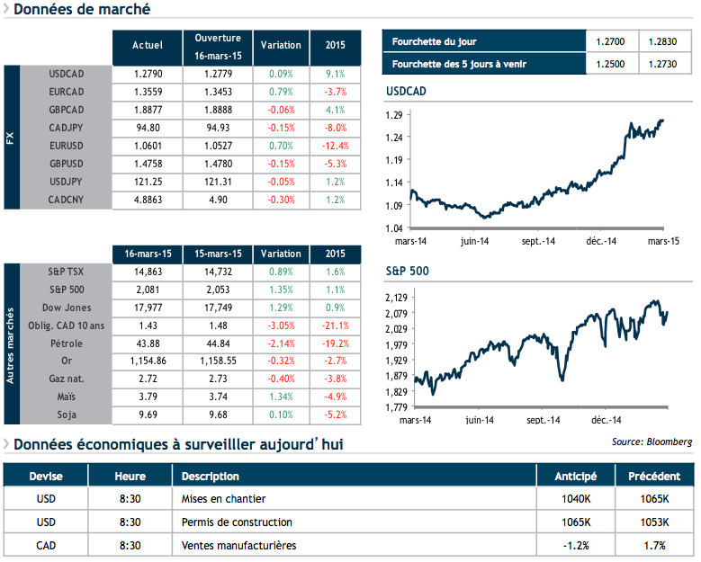 Le marché des actions semble indiquer qu’à ce niveau actuel, le dollar américain pourrait offrir de la latitude à la Réserve fédérale américaine en ce qui a trait à sa décision d’augmenter le taux directeur. Effectivement, l’indice S&P 500 a connu une journée de forts gains malgré la parution de chiffres économiques relativement décevants aux États-Unis.