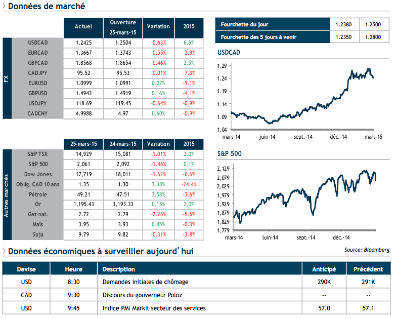 Au niveau des bourses, après une session difficile, hier, où les principaux indices ont clôturé en baisse, tout indique ce matin une ouverture en territoire négatif. Bref, dans son ensemble, un environnement propice à des vagues de volatilité et possiblement, des opportunités. Laisser des ordres auprès de votre cambiste pourrait être sage.