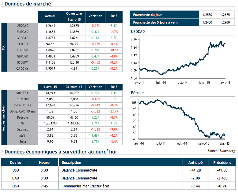 À noter que nous serons fermés pour Pâques demain, mais que les données sur l’emploi aux US seront tout de même publiées en matinée. Il pourrait être intéressant de laisser des ordres au marché. Nous vous invitons donc à communiquer avec votre cambiste.