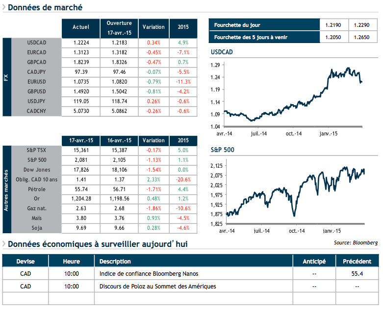 Les commentaires du gouverneur de la Banque du Canada (BdC), la semaine dernière, jumelés à la publication de la donnée de l’inflation vendredi, ont permis au dollar canadien de terminer la semaine en hausse de près de 250 points vis-à-vis l’USD. Propulsée par la publication de Statistiques Canada de l’IPC au Canada, pour le mois de mars, cette dernière a confirmé une progression de l’inflation de l’ordre de 2.4 % depuis la dernière année, alors que le consensus visait un chiffre de 2.1 %. Malgré le faible coût du baril de pétrole, ce dernier a notamment été contré par la hausse des prix des aliments. Alors que nous ne pouvons parler de changement de politique monétaire au Canada, les taux d’intérêt fixes canadiens semblent s’ajuster en conséquence puisque nous remarquons une hausse de près 0.10 % sur la majorité des échéances.