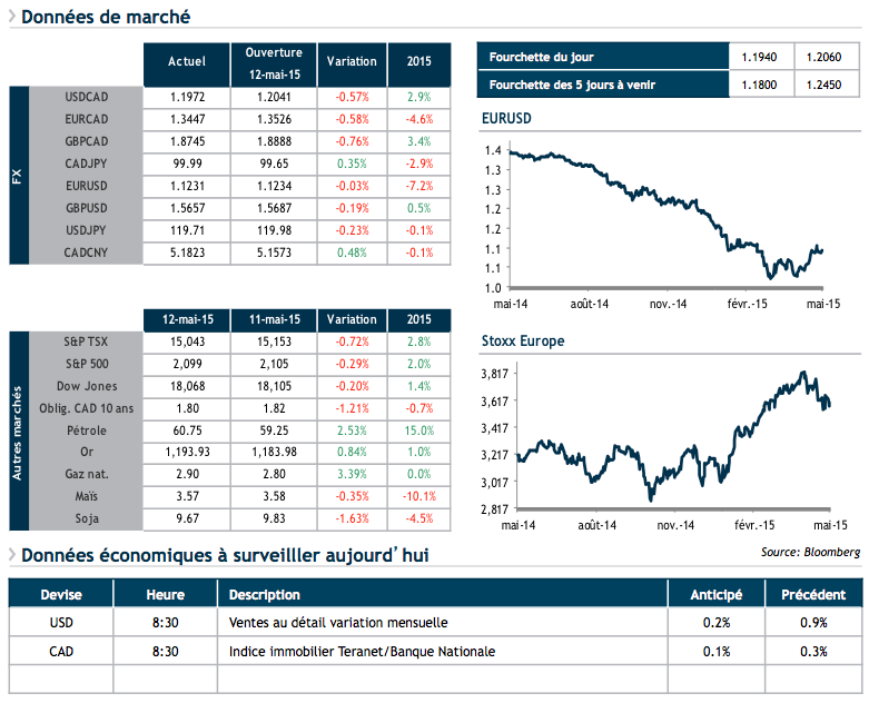 Quelques nouvelles en Amérique du Nord à 8h30 ce matin ; les ventes au détail aux E-U et l’indice Teranet / Banque Nationale du prix des maisons au Canada. Ce pourrait être l’occasion pour le CAD de retenter les niveaux de support établis au cours des 2 dernières semaines.