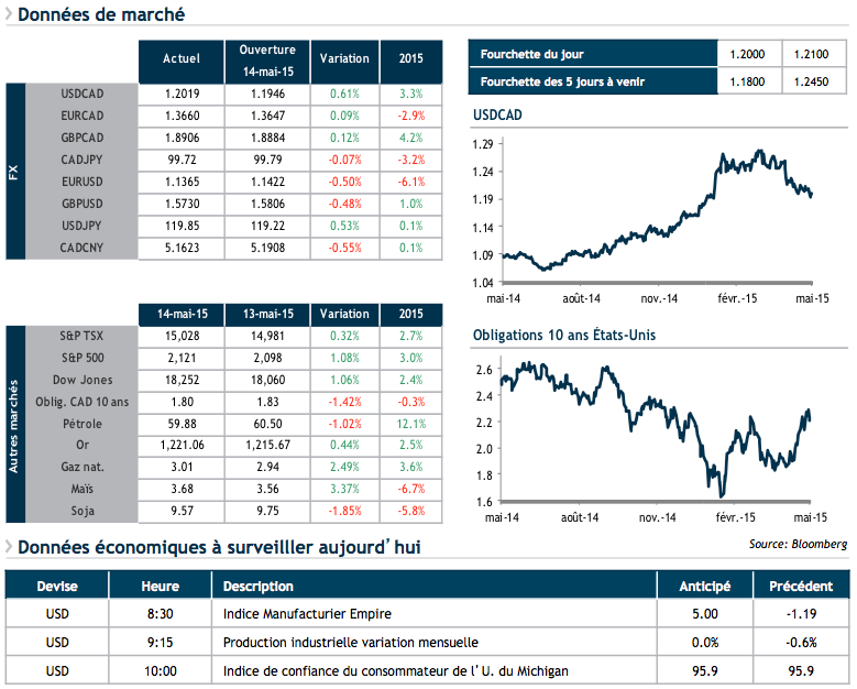 Hier, la publication de l’indice des prix à production aux États-Unis (PPI) a révélé des données nettement inférieures aux attentes. Excluant les composantes plus volatiles, l’indice PPI a connu une chute annuelle de 1.3%, alors que les économistes anticipaient un déclin de 0.8%. Il sera intéressant de suivre si cette tendance se reflètera au niveau des prix à la consommation et de l’inflation en général, car une faible inflation pourrait inciter la Réserve fédérale américaine à l’inaction. Hier, les taux d’intérêt américains, qui sont en hausse depuis la mi-avril, ont chuté par plus de 20 points. Aussi, le dollar américain a poursuivi son recul face aux grandes devises.