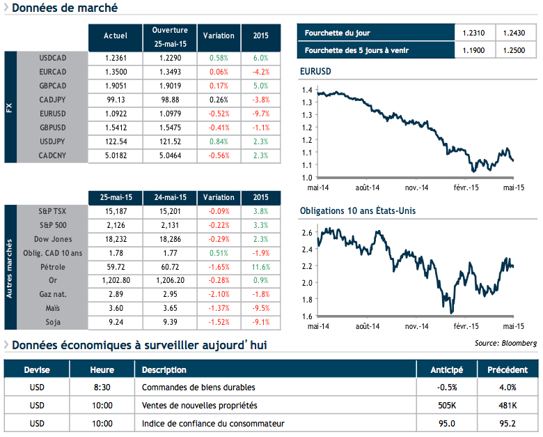 Dans l’attente de la réunion de la Banque du Canada prévue demain, plusieurs nouvelles économiques sont attendues aujourd’hui aux États-Unis. Nous surveillons les commandes de biens durables à 8h30, l’indice du prix des maisons Case-Shiller à 9h, ainsi que la confiance des consommateurs américains à 10h. Des données au-dessus des attentes des économistes soutiendraient le dollar américain, mais pèserait sur le marché obligataire.