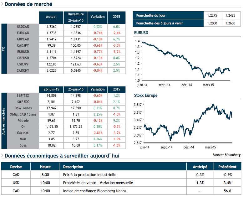 En effet, la possibilité de voir la Grèce quitter l’Europe sera sur toutes les lèvres, ce matin. Le gouvernement grec a fait un pas de plus dans cette direction en fin de semaine, suite à sa décision de tenir un référendum sur les dernières propositions financières européennes. M. Tsipras et son équipe ont annoncé qu’ils plaideraient en faveur du rejet de ces propositions. L’euro s’est déprécié brièvement, ce matin, de près de 2 % contre le dollar américain et canadien avant de revenir à son niveau de fermeture de vendredi. Ce mouvement illustre bien la nervosité des marchés en ce début de semaine!