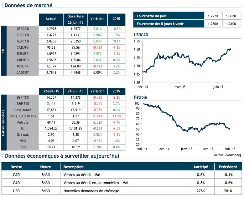 Il aura simplement fallu la confirmation que les ventes de résidences existantes aux États-Unis ont atteint, en juin, leur sommet des huit dernières années et l’annonce d’inventaires de pétrole plus élevés que prévu pour relancer la vigueur du USD. Si déjà en début de session, le billet vert avait amorcé son ascension face à l’ensemble des devises, les nouvelles auront contribué entres autres à le faire grimper de près d’un sou contre la paire USD/CAD. Quant au pétrole, le baril a chuté sous les 50 $. À ce stade donc, difficile de s’opposer au concept d’un éventuel recul additionnel pour le huard qui a revisité, hier, ses pires niveaux depuis mars 2009.