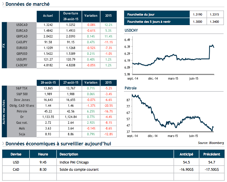 Nous aurons d’ailleurs droit vendredi aux données d’août sur l’emploi de part et d’autre de la frontière. Quant aux turbulences, le CNY affiche, ce matin, une 4e session consécutive de gain, alors que le Premier ministre Li considère que rien ne justifie un recul additionnel de sa devise. C’est à se demander ce qui a changé depuis le 10 août dernier.