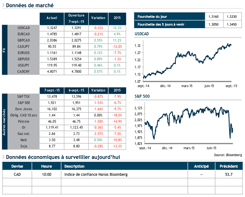 Aujourd’hui, à 10 h, la Banque du Canada (BdC) rendra sa décision par rapport au taux directeur. Même s’il est difficile d’affirmer que les conditions économiques se sont significativement améliorées au pays depuis la coupure de taux en juillet dernier, la majorité des observateurs anticipent le statu quo. Les nombreuses incertitudes reliées aux perspectives économiques chinoises continuent d’inquiéter les marchés et influencer négativement le cours des commodités, dont celui du baril de pétrole. Malgré un récent rebond, le baril de pétrole continue de se transiger à des niveaux semblables à ceux connus durant la crise de 2008, ce qui demeure inquiétant pour les pays producteurs comme le Canada.