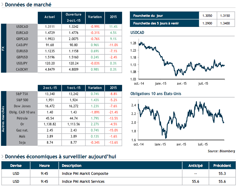 Vendredi dernier, la publication du rapport d’emplois américain du mois de septembre a eu l’effet d’une douche froide sur les marchés financiers. Le rapport a révélé que seulement 142K emplois furent créés le mois dernier, alors que les observateurs s’attendaient à une création de plus de 200K emplois. Comble de malheur, le rapport du mois d’août fut révisé à la baisse de près de 40K emplois. En considérant toutes les dernières révisions, la création d’emplois aux États-Unis durant le troisième trimestre de 2015 fut la plus faible depuis trois ans, de quoi ranimer les débats reliés à l’annonce d’une première hausse de taux par la Réserve fédérale. En réaction, les taux d’intérêt américains se sont contractés, alors que le billet vert a reculé par rapport aux autres grandes devises.