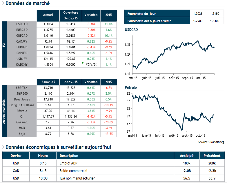 La présidente de la Fed, Janet Yellen, témoignera aujourd'hui devant le congrès américain pour discuter du rôle de supervision des marchés financiers de la Réserve fédérale. Le congrès va sans doute en profiter pour la questionner au sujet des projections économiques, étant donné que la Fed se prépare à hausser les taux d'intérêt en décembre. La probabilité de cette hausse, présentement évaluée à 52%, variera selon les commentaires de Madame Yellen et la publication de données importantes sur l’emploi ce vendredi. Selon notre économiste en chef, Stéfane Marion, le cycle de resserrement de la Fed sera bref, compte tenu de la fragilité de la reprise globale et l'inflation timide.