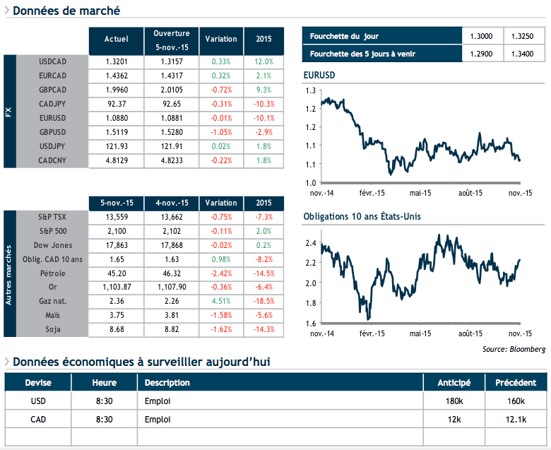 Au moment d'écrire ces lignes, nous attendons les chiffres d'emplois. Au Canada, les attentes pour l'enquête sur la population active d'octobre sont une création de 30,000 postes, ce qui ferait baisser le taux de chômage à 7 %. Du côté des États-Unis, après un troisième trimestre qui a généré la plus faible augmentation d’emplois créés en trois ans, on espère partir le quatrième trimestre du bon pied, avec 180 k nouveaux postes. Le dollar US, qui s’approche de son plus haut niveau contre l’euro depuis juillet, est particulièrement vulnérable à une baisse à court terme si la création d’emploi déçoit.