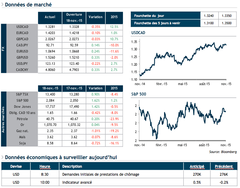 La journée d’hier fut marquée par la publication du procès-verbal de la dernière réunion de politique monétaire de la Réserve fédérale américaine. La publication a confirmé qu’une majorité des membres avait déjà, en octobre dernier, une opinion relativement positive quant à l’économie américaine et que les conditions pourraient être favorables à une hausse des taux. Plus récemment, dans leurs discours respectifs, les membres du comité n’ont pas contredit cette thèse. Enfin, à moins d’une surprise, il semble qu’après tout la Fed prépare effectivement une légère augmentation du taux directeur en décembre.