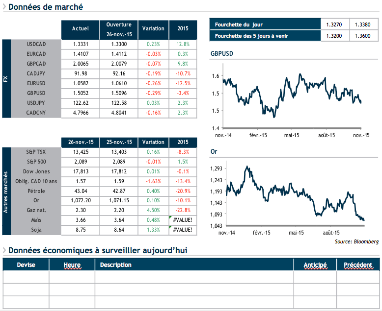 Il en résulte donc un billet vert légèrement à la hausse face à l’ensemble des devises, mais les indices boursiers nord-américains ne semblent pas vouloir emboîter le pas. Rappelons d’ailleurs que ces derniers fermeront plus tôt aux États-Unis afin d’étendre les célébrations. Le Royaume-Uni nous a livré son résultat de croissance au 3e trimestre, affichant un PIB en hausse de 0.5 % sur une base trimestrielle. Rien pour presser à la Banque d’Angleterre à resserrer ses conditions monétaires.
