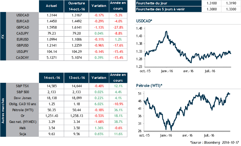 Au Canada, l'événement qui retiendra l'attention en milieu de semaine sera l’annonce de la Banque du Canada sur les taux d’intérêt et la publication du Rapport sur la politique monétaire. Finalement, aux États-Unis, nous en saurons plus sur la croissance au troisième trimestre grâce à la publication de la production industrielle qui sera publiée ce matin.