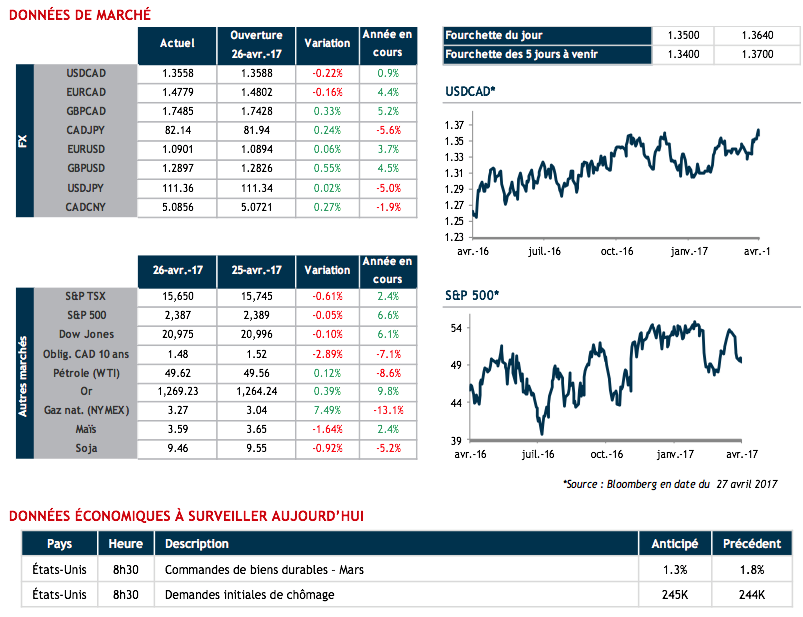 La correction s’est poursuivie hier pour le dollar canadien qui est la devise du G10 ayant connu la pire performance face au dollar américain depuis le début du mois d’avril! Les difficultés des prix de l’énergie, les tweets de Donald Trump, la renégociation prochaine de l’ALÉNA et les craintes de surchauffe du secteur immobilier canadien poussent les investisseurs à la prudence! Ces derniers sont également incertains devant l’ébauche de réforme fiscale proposée hier par le Président Donald Trump laissant entrevoir une baisse significative du taux d’imposition des entreprises.