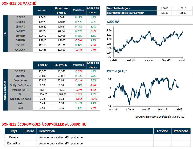 La session d’hier a été relativement tranquille tandis que l’Europe et l’Asie célébraient le 1er mai. L’absence de publication significative aujourd’hui porte à croire que l’accalmie pourrait perdurer devant des classes d’actifs au ralenti, possiblement en attente de la décision de la Réserve fédérale de demain.