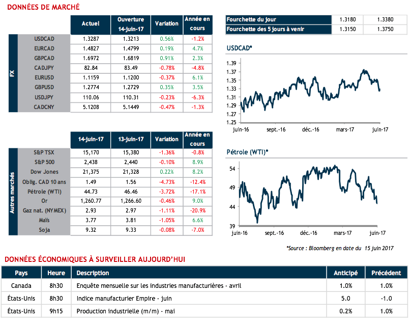 Sur le USDCAD, on pourrait assister à une correction dans la zone 1.3300-1.3500, surtout grâce à un baril de pétrole (WTI) qui a plongé de 3.5% mercredi. Il est important de rappeler qu’il y a peu de changement dans le ton de la Fed alors que celui de la Banque du Canada est bien plus optimiste qu’auparavant. Cette différence devrait empêcher toute dépréciation rapide de notre devise, sauf bien sûr si des évènements imprévisibles survenaient; tarifs douaniers imposés au Canada dans le cadre des renégociations de l’ALENA par exemple.