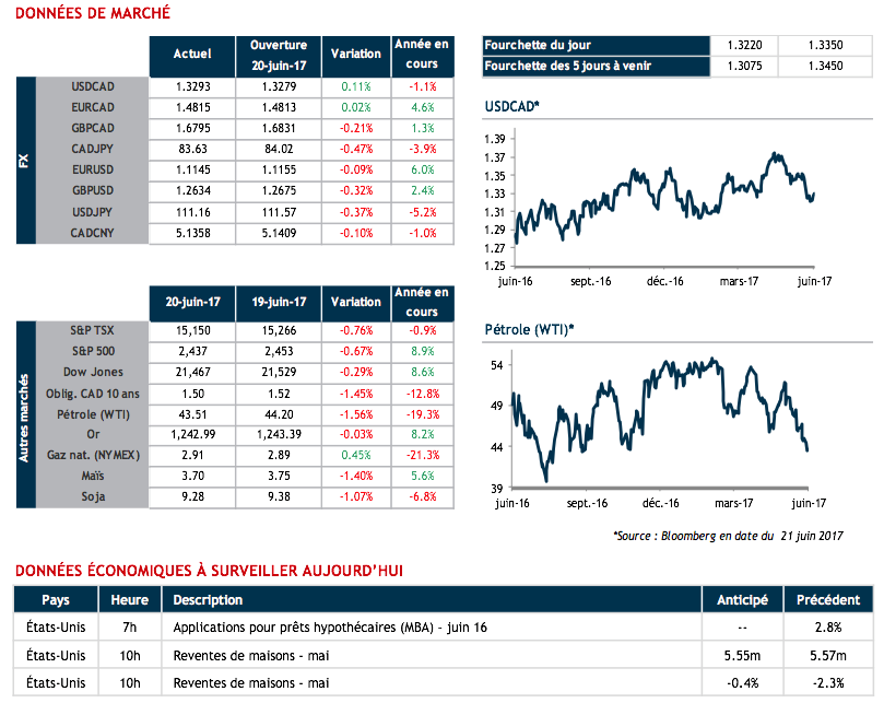 Hier, le pétrole WTI a chuté de 2,2% pour atteindre son prix le plus bas en 2017, aboutissement d’une chute de 20% depuis le mois de février. Le mouvement observé mardi était motivé par la hausse de la production de la Libye et par un sentiment général négatif par rapport à la capacité de l’OPEP d’atteindre son objectif de réduire les stocks mondiaux. La nouvelle a eu un effet minime sur le dollar canadien qui s’est déprécié de 0,4% par rapport à son homologue américain.