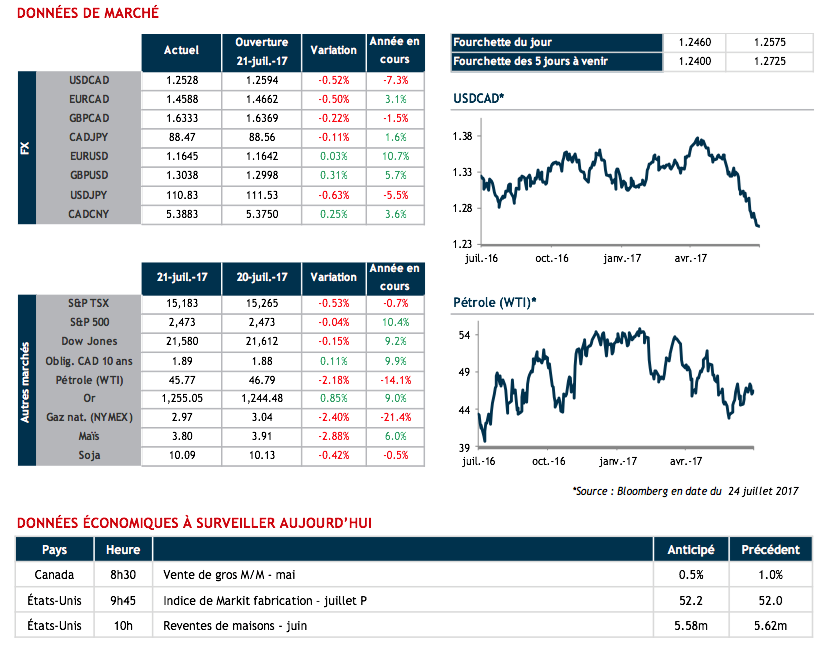 Le dollar canadien ne démontre aucun signe de fatigue depuis le début de son ascension, qui lui a valu un gain de près de 1% pour la semaine dernière et de près de 9% depuis le sommet du mois de mai. L'inflation canadienne publiée vendredi a connu une croissance annualisée de +1% pour juin et les ventes au détail ont favorablement surpris le marché avec une croissance de +0.6% en mai contre des attentes de +0.3%.