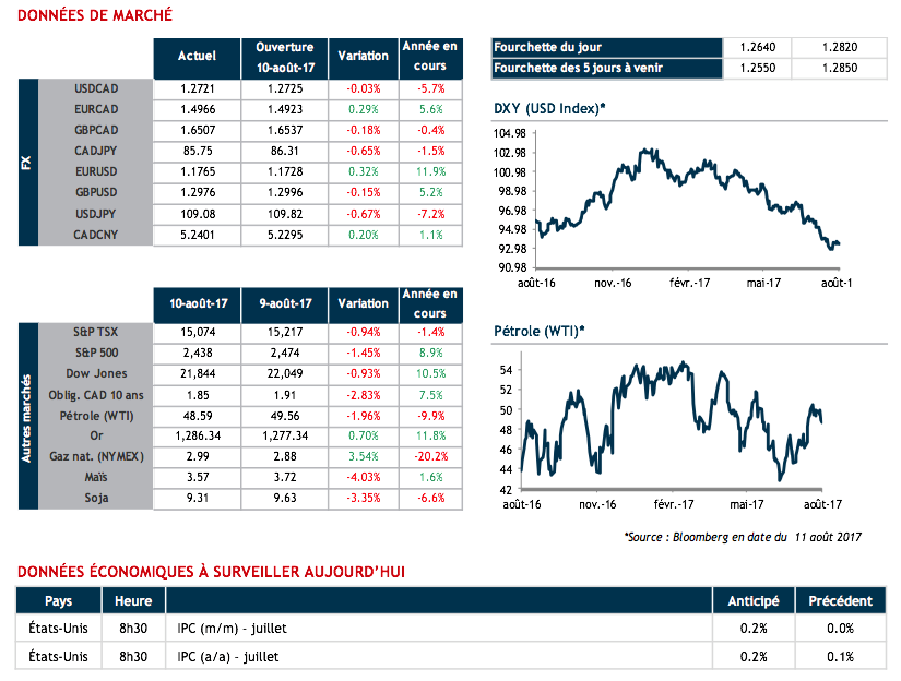 Ce fut une journée particulièrement difficile hier pour la majorité des classes d’actifs alors que nos écrans étaient couverts de rouge. L’escalade des tensions avec la Corée du Nord est encore une fois à blâmer pour les prises de profits massives sur les marchés boursiers. Le S&P500, le Nasdaq et l’indice TSX de la bourse de Toronto ont respectivement perdu 1.45%, 2.13% et 0.94%. La séance fut tout aussi difficile pour le prix du pétrole brut WTI qui était en recul de 1.96%. Les investisseurs se sont réfugiés vers le dollar américain, le prix de l’or et le marché des obligations. De son côté, l’indice de volatilité implicite VIX se situe actuellement à son plus haut niveau depuis le mois de novembre 2016.