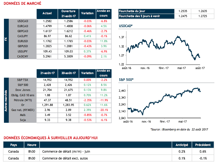 Le dollar canadien semble avoir été affecté par l'éclipse lunaire lundi alors que notre devise a gagné du terrain malgré le recul de 2,4% du pétrole brut WTI et les données économiques décevantes. En effet, après avoir augmenté au courant des 8 derniers mois pour atteindre un niveau inégalé en mai, les ventes de gros pour le mois de juin ont reculé de 0,5%. Cinq des sept sous-secteurs de l’économie ont enregistré des baisses.