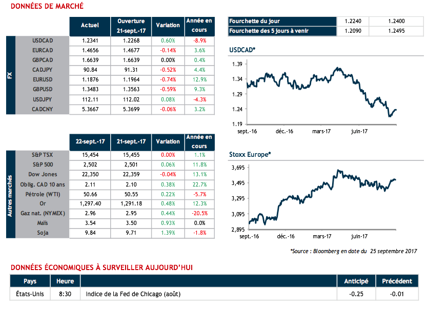Le parti de centre droit d’Angela Merkel a remporté hier sans surprise un quatrième mandat en Allemagne. Les élections ont toutefois été marquées par une percée du mouvement anti-immigration Alternative pour l’Allemagne (AfD) qui a récolté 12.8% des votes et qui participera au gouvernement de coalition prochainement formé. Ce résultat rappelle, dans une moindre mesure, les vagues de contestation observées dans d’autres pays occidentaux envers les partis établis. Sur la nouvelle, l’EUR s’est déprécié par rapport au CAD et au USD.