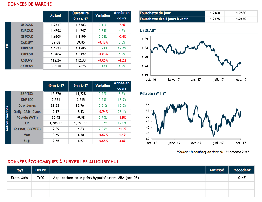 Le procès-verbal de la dernière rencontre du FOMC, qui sera publié aujourd’hui à 14h, nous donnera plus de détails sur les anticipations de croissance économique. On se rappelle qu’à la grande surprise de plusieurs, les membres de la Réserve fédérale américaine ont profité de la rencontre de septembre pour annoncer au marché que la croissance économique pour l’année courante sera plus élevée que prévu. Les probabilités d’une hausse de taux en décembre étaient alors passées de 57% à 67% et ce fut un moment décisif pour le dollar US.
