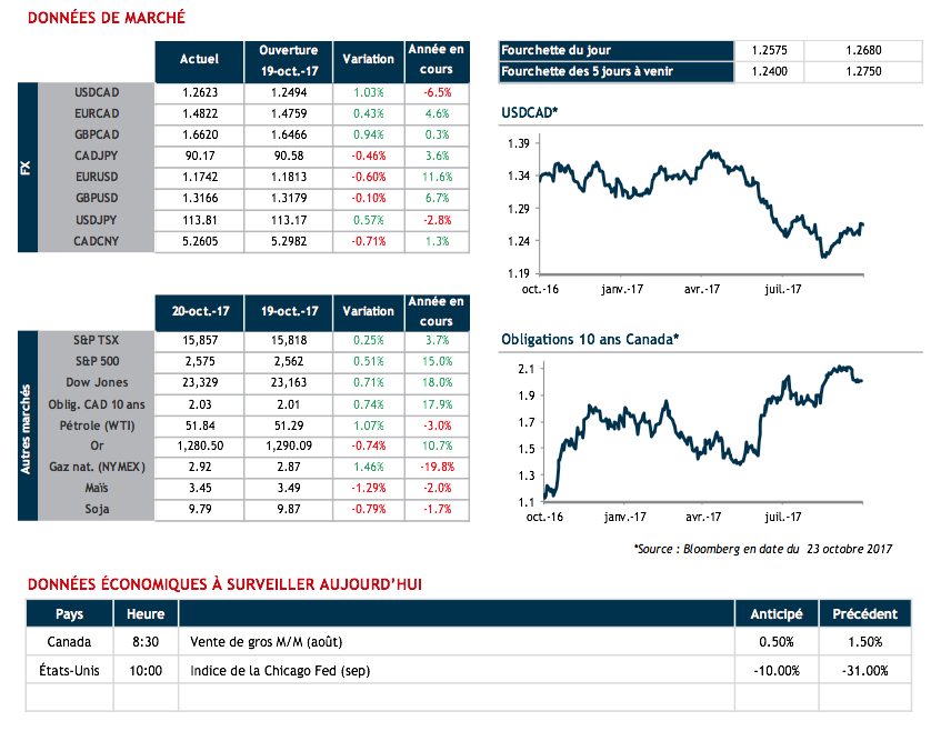 C’est un peu plus de 1% que le huard aura perdu la semaine dernière en raison des incertitudes entourant l’ALENA, mais également en raison de l’absence de pressions inflationnistes au pays ainsi que des données de dépenses de consommation décevantes. Autre conséquence, les probabilités aux yeux du marché que M. Poloz annonce une autre hausse du taux directeur ce mercredi sont pratiquement nulles tandis qu’elles sont partagées pour décembre.