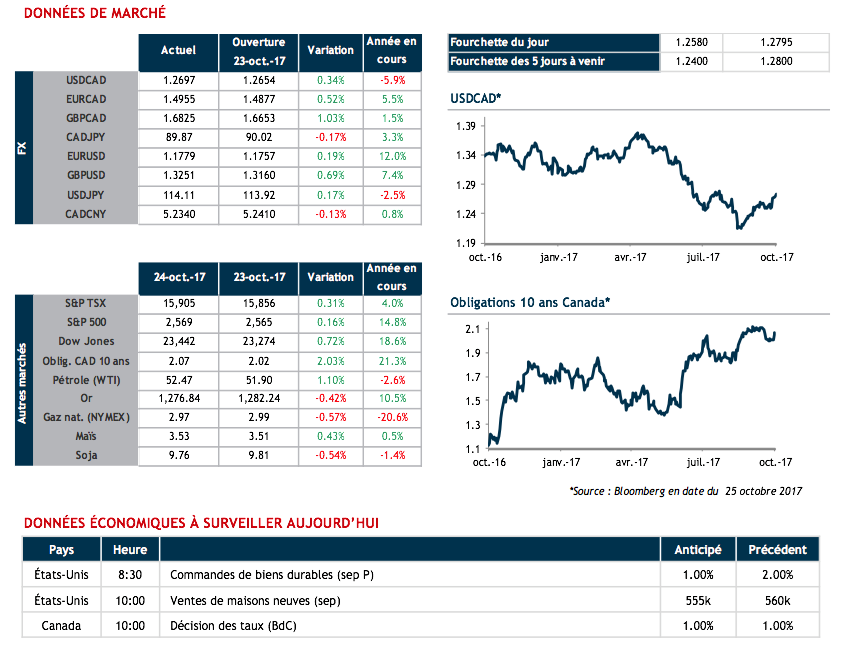 C’est aujourd’hui à 10h00 que la Banque du Canada (BdC) annoncera sa décision tant attendue sur sa politique monétaire. Si la perspective que cette dernière demeure inchangée cette fois fait l’unanimité, il en est tout autrement en ce qui a trait à la dernière rencontre de l’année, soit celle du 6 décembre prochain. Autant peut-on se rabattre sur une économie et un secteur de l’emploi plus vigoureux que prévu, on ne peut écarter certaines sources d’inquiétudes telles que l’issue de l’ALENA, le ralentissement des exportations et une correction immobilière. Dans un tel contexte, la conférence de presse à 11h15 de M. Poloz et Mme Wilkins sera d’un grand intérêt.
