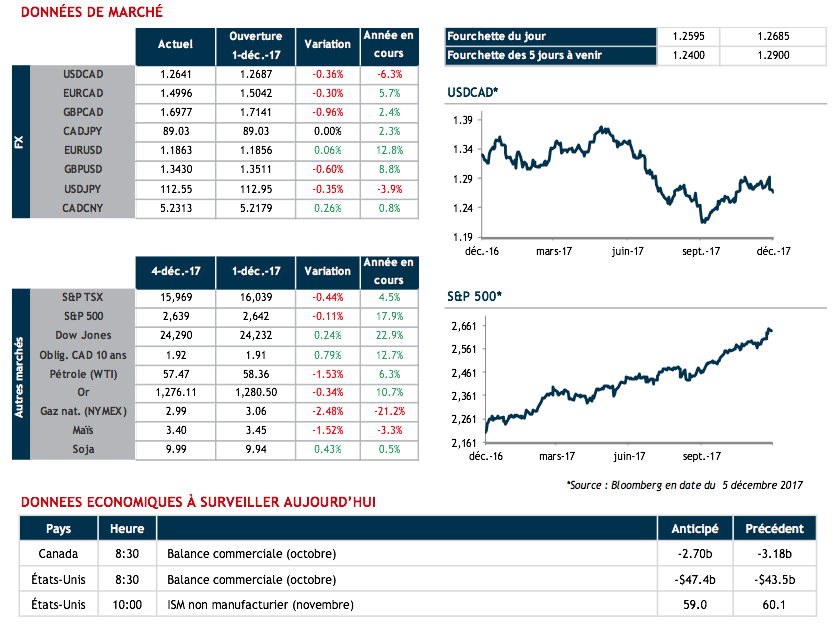 Côté devises, la réforme semble avoir été bien accueillie, tel qu’illustré par des gains du USD face aux grandes devises. Notre huard a cependant bien résisté, toujours porté par les impressionnants chiffres économiques canadiens de vendredi dernier. Dans ce contexte, les vendeurs de USD devraient profiter de tout rebond. Le haut de la fourchette 1.2000 et 1.3000 de nos économistes semble bien loin actuellement.
