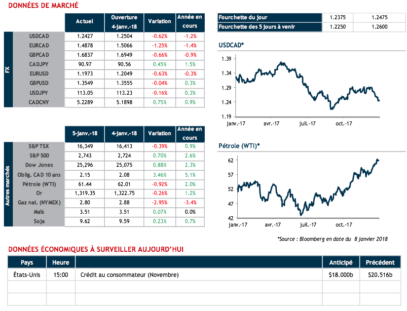 L’onde de choc provoquée par la publication vendredi dernier de l’impressionnante feuille de route en matière de création d’emploi au Canada aura permis à notre devise de revisiter ses sommets de la fin septembre 2017. L’incessante vigueur de notre secteur de l’emploi combinée aux autres bonnes données économiques au pays a ramené à plus de 83% les probabilités d’une hausse du taux directeur le 17 janvier prochain.