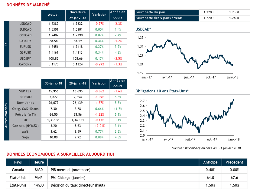 Journée inhabituelle hier sur les devises. Les principales paires ont connu très peu de variation. Ailleurs par contre, on a pu noter des mouvements plus forts. L’indice boursier américain S&P 500 a perdu 1% et le Dow Jones 1.40%. En Europe et en Asie mardi, les baisses étaient aussi de l’ordre de 1%. C’est peu par rapport aux gains déjà réalisés depuis le début de l’année mais c’est à suivre de très près car souvent l’impact sur les devises peut être fort. Si la baisse des indices boursiers se poursuit et s’accélère, on pourrait entrer dans un climat d’aversion au risque avec comme conséquence une baisse du CAD et une hausse de la devise japonaise, ce qui n’est pas été le cas hier.