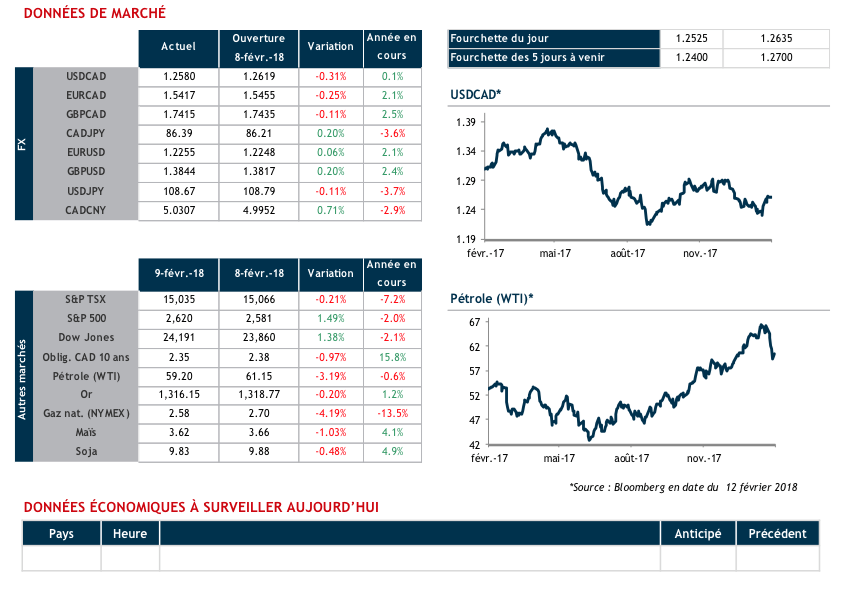 La volatilité s’est maintenue dans les marchés financiers alors que les bourses mondiales ont subi une autre session mouvementée vendredi dernier. Les indices boursiers américains ont toutefois réussi à effacer d’importantes pertes pour clôturer la session en hausse. Malgré cela, le Dow Jones et le S&P 500 sont maintenant en baisse de 2% depuis le début de l’année. La contagion s’est fait ressentir dans la majorité des classes d’actifs, dont le pétrole brut WTI en baisse de plus de 6% depuis un mois. Le sentiment général semble s’améliorer ce matin.