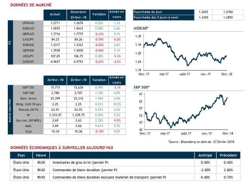 À défaut de publications économiques majeures, les membres de différentes banques centrales prennent l’avant-plan. Du côté de la Réserve fédérale américaine (Fed), James Bullard, président du district de St-Louis et membre non-votant mentionnait hier qu’un trop grand nombre de hausses de taux pourrait ralentir l’économie américaine. Selon M. Bullard, cette dernière traverse une belle période minimisant la récente correction boursière. D’ailleurs, les principaux indices ont rebondi hier, le Dow Jones notamment enregistrant des gains de près de 400 points. Reste à voir si Jerome Powell abondera dans le sens de son collègue à 10h00 ce matin.